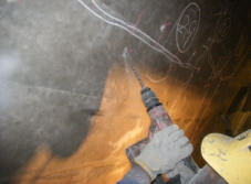 注入孔は斜めに削孔し、間隔は200mm~250mmとし、削孔時に発生した切り粉は、エアーブローまたは水洗いにて入念に除去します。