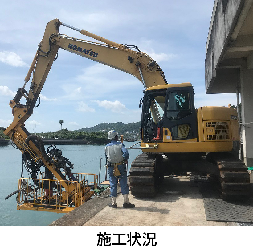 - 岸壁用グラウンドアンカーにおいて専用の削孔機をバックホウに搭載した削孔システムで行う技術で、仮設構台や台船を利用することなく、海側から削孔作業が可能