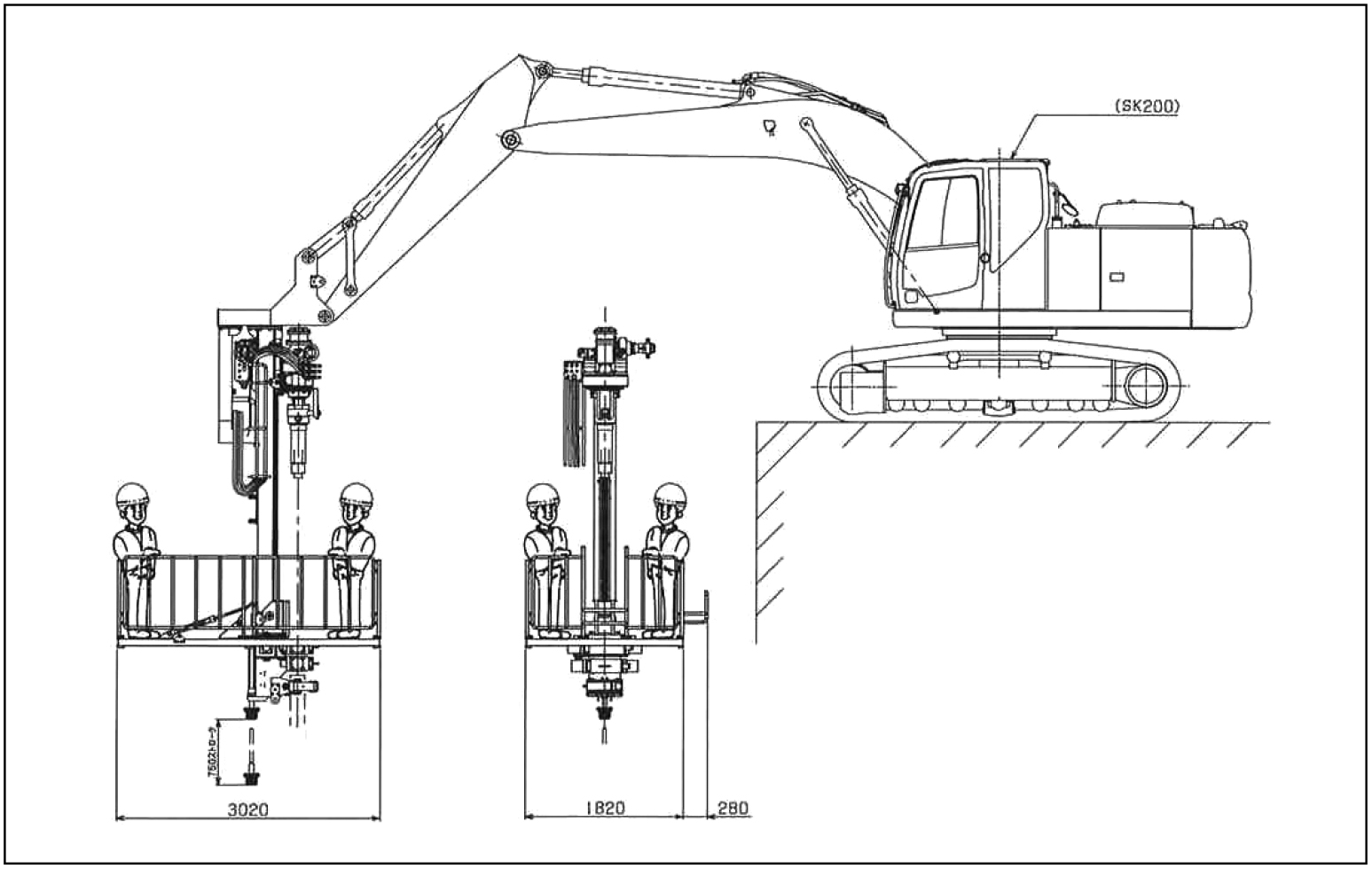 - 岸壁用グラウンドアンカーの削孔作業において専用の削孔機をバックホウに搭載して行う削孔システム