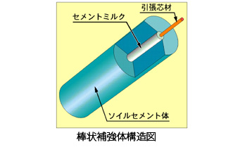 ラディッシュアンカー工法とは、従来の鉄筋挿入工法を改良し、撹拌混合方式の地盤改良技術を応用することによりφ150~φ400mmの太径化を実現したものです。