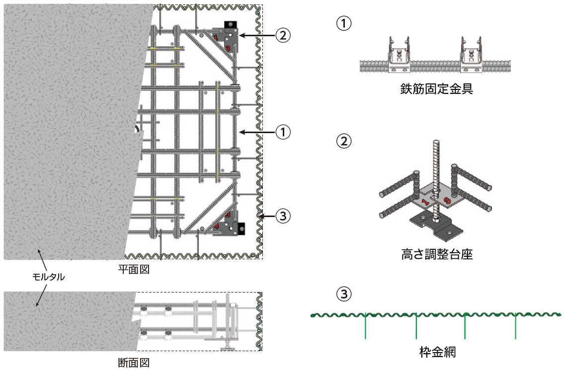 鉄筋の組立はワンタッチ構造を採用することで組立作業能率を改善。 - 高所での施工が可能で材料ロスの低減