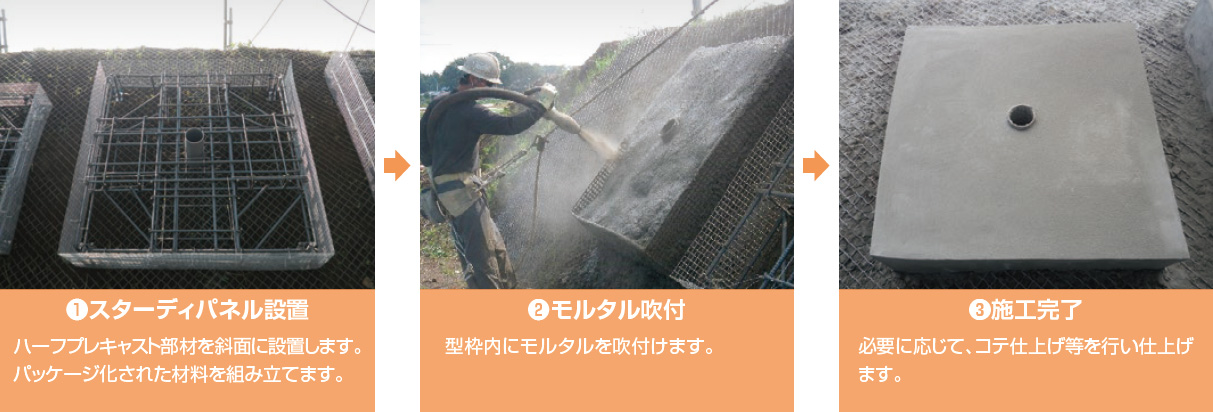 スターディパネル工法は、従来の現場打ちコンクリート受圧板やプレキャスト受圧板に代わる、グラウンドアンカー用の受圧板工法です。現場打ちコンクリート受圧板やプレキャスト受圧板には、施工性や適用可能な現場条件などに多くの課題がありました。スターディパネル工法は、独自のアイデアで「軽い」「早い」「頑丈」を実現した全く新しいタイプのハーフプレキャスト吹付受圧板です。
